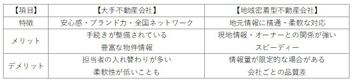 大手は全国ネットワークで安心感があり、地域密着型は地元情報に強みを持ちます。