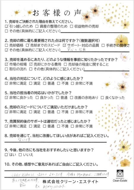 資産整理のための売却でしたが、クリーン・エステイトさんのご対応に非常に満足しています。担当者の対応にも非常に満足しています。今後、お知合いの方にも是非クリーン・エステイトさんをご紹介したいと思っています。売却価格については、少し不満もありました。お取引の日程変更の際に不安を感じる事もありましたが、いろいろと助けて頂き本当にうれしかったです。